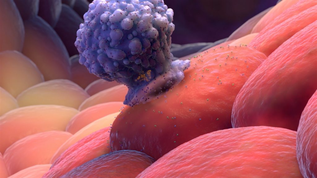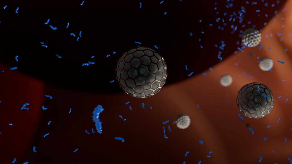 Pulsatile blood flow takes you on a ride as a red blood cell through the circulatory system in the Nanot animation. We begin the animation with the role of natural killer (or NK) cells as a part of the innate immune system that defends against cell malfunction as well as foreign particles (like bacteria or viruses). NK cells have a mechanism to identify and destroy damaged or diseased cells. However, tumor cells release certain receptors and chemicals, which makes them less likely to be destroyed, thus ‘hiding’ from the innate immune system. Nanot nanoparticles are multilayered structures designed to bind to these protective molecules released by tumor cells into the microenvironment. Once these soluble molecules are removed from the tumor microenvironment, the innate immune system is better able to identify and destroy the aberrant cells. The length of the animation allows the viewer to experience extended zoom into tissues and cells and more time to describe and understand the underlying biology.