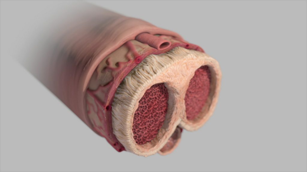 Peyronie’s disease is caused by plaque in the penile tissue. The light beige tissue is the tunica albuginea. It surrounds the corpora cavernosa, and in this condition, it is chronically inflamed.
